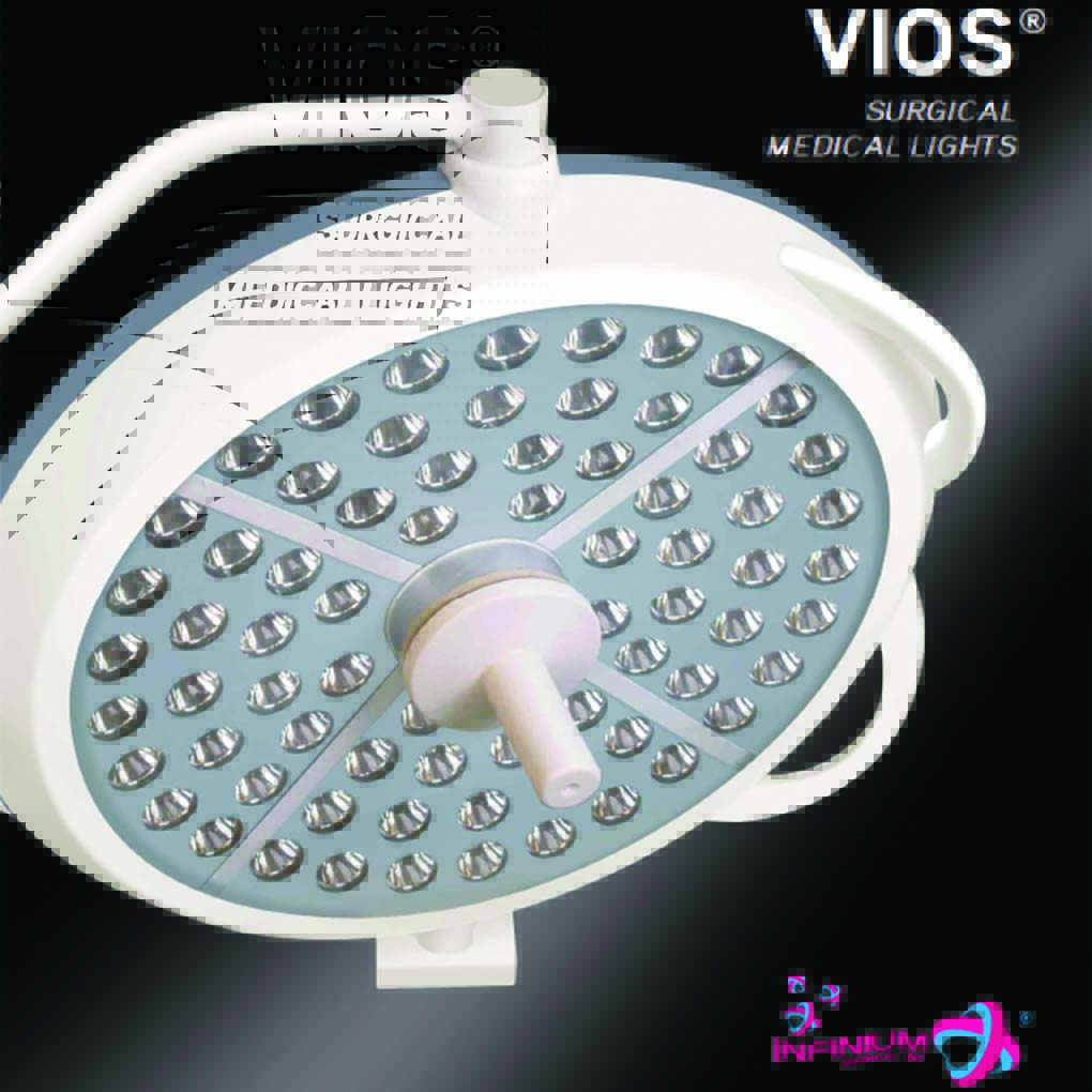 The Infinium VIOS® surgical light system sets a new standard in the operating room. The VIOS® LED system provides pure white light up to 160,000 LUX with a 50,000-hour lifespan. The revolutionary VIOS® LED design allows for no emission of heat, UV, or Infrared rays. The Infinium VIOS® surgical light promotes patient safety and cost saving while eliminating the need for bulb changes and eliminating the risk of a bulb burn out during a surgical procedure. The Vios® surgical light system is mounted on a counterbalanced ceiling suspension mount that allows for easy re-positioning and offers a multitude of lighting angle